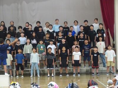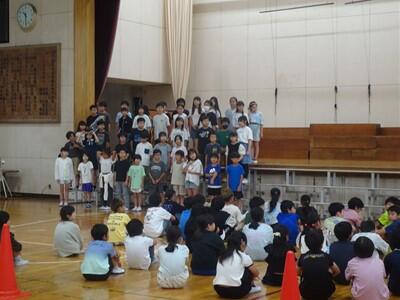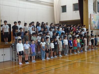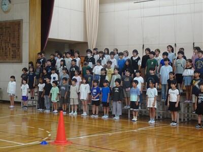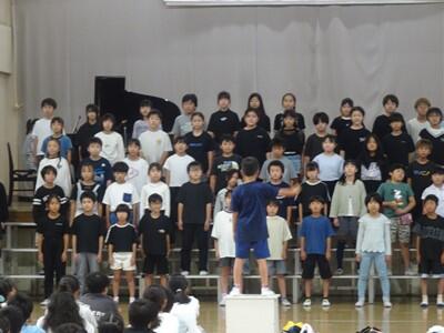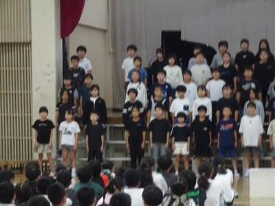 前日の児童朝会では全校児童の前で披露。多くの保護者に皆さまも駆けつけていただき緊張の中歌いあげました。