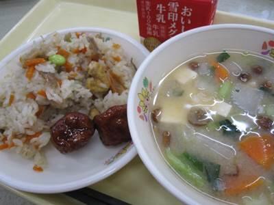 今日は、自校ご飯「五目御飯」と「なめこ汁」が出ました。